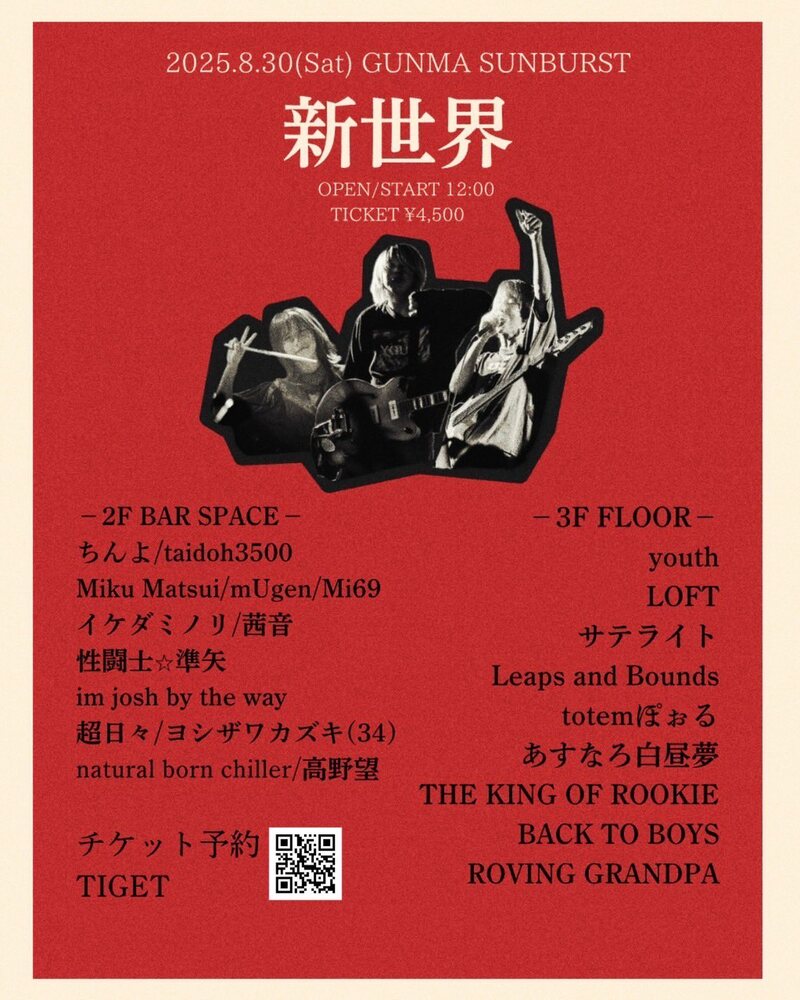 新世界 SCHEDULE 2025/08/30(土) GUNMA SUNBURST [群馬] 地図を表示 OPEN / START 12:00 ADV ¥4,500 チケット購入 URLをコピーする 報告する