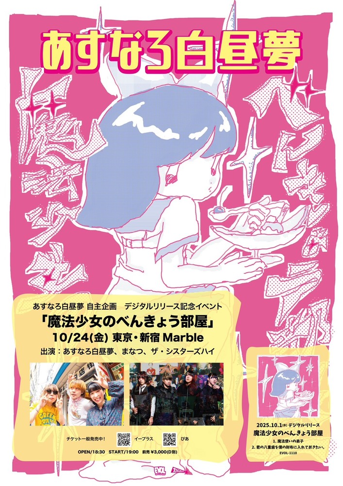 【主催】魔法少女のべんきょう部屋 SCHEDULE 2025/10/24(金) 新宿Marble [東京] 地図を表示 OPEN 18:30 / START 19:00 前売り ¥3,000 w) まなつ / ザ・シスターズハイ チケット購入 URLをコピーする 報告する