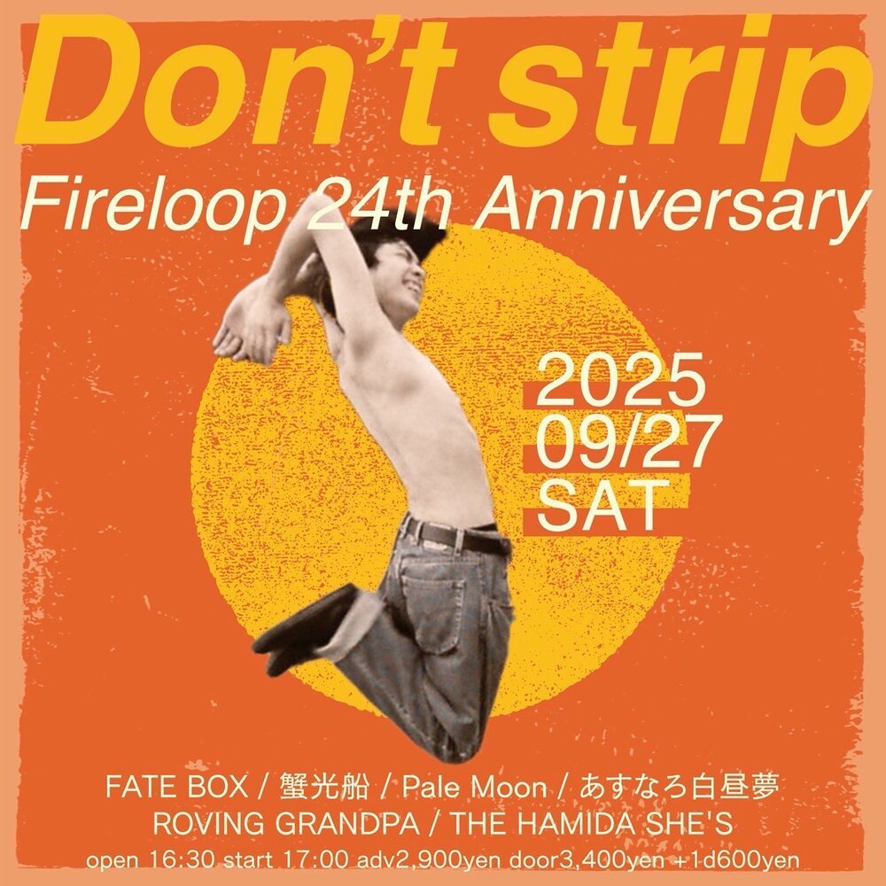 Fireloop 24th Anniversary 『Don't strip』 SCHEDULE 2025/09/27(土) 寺田町Fireloop [大阪] 地図を表示 OPEN 16:30 / START 17:00 ADV ¥2,900 / DOOR ¥3,400 w) FATE BOX / 蟹光船 / Pale Moon / ROVING GRANDPA / THE HAMIDA SHE'S 取り置き URLをコピーする 報告する