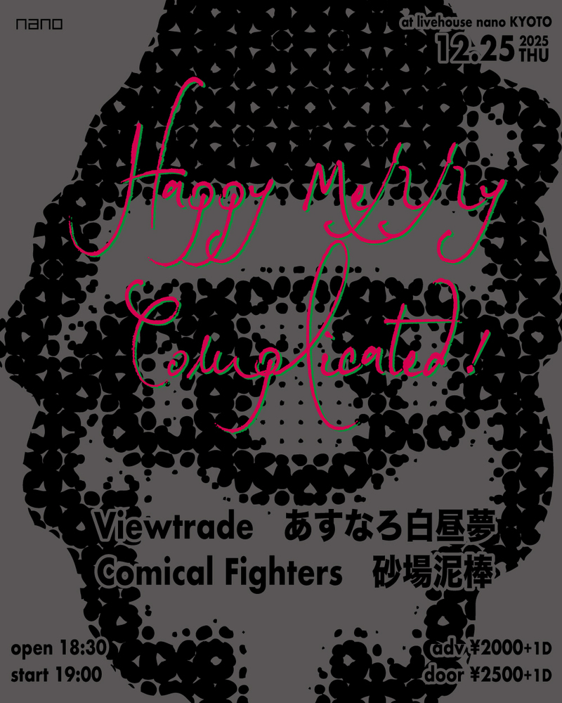 Happy Merry Complicated! SCHEDULE 2025/12/25(木) 京都nano 地図を表示 OPEN 18:30 / START 19:00 ADV ¥2,000 / DOOR ¥2,500 w) Viewtrade / Comical Fighters / 砂場泥棒 取り置き URLをコピーする 報告する